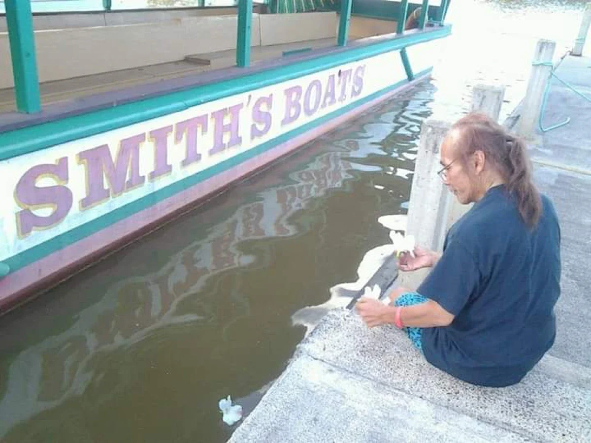 Jovann scattering flowers for Alana next to the Smith’s Fern and Grotto Tour boat on Wailua River on Kaua’i, 2015