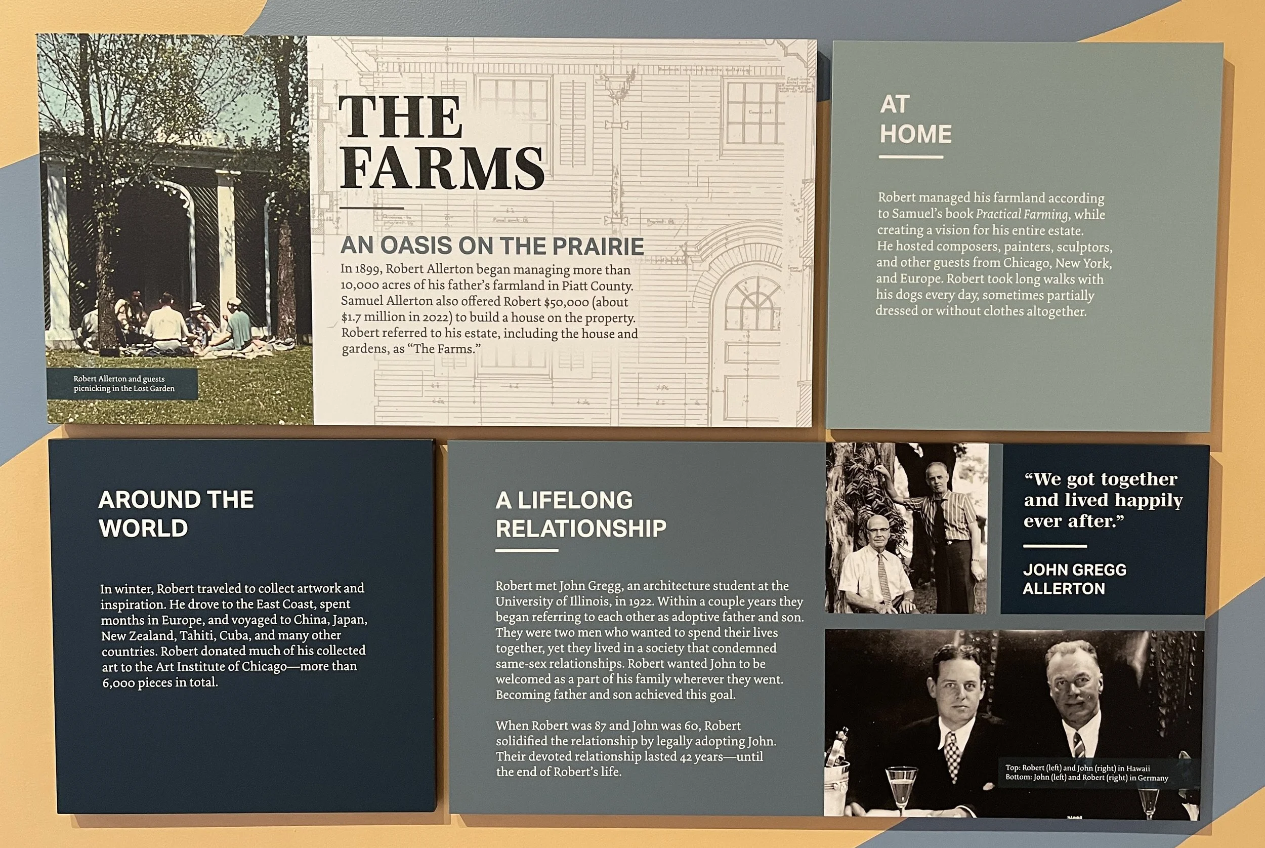 The nature of their relationship is mentioned on the website of the Allerton Garden on Kauai, while more public facing recognition of the special bond between Robert and John Gregg Allerton can be seen in the visitor center at Allerton Park & Retreat Center in Illinois, which includes the panel below.