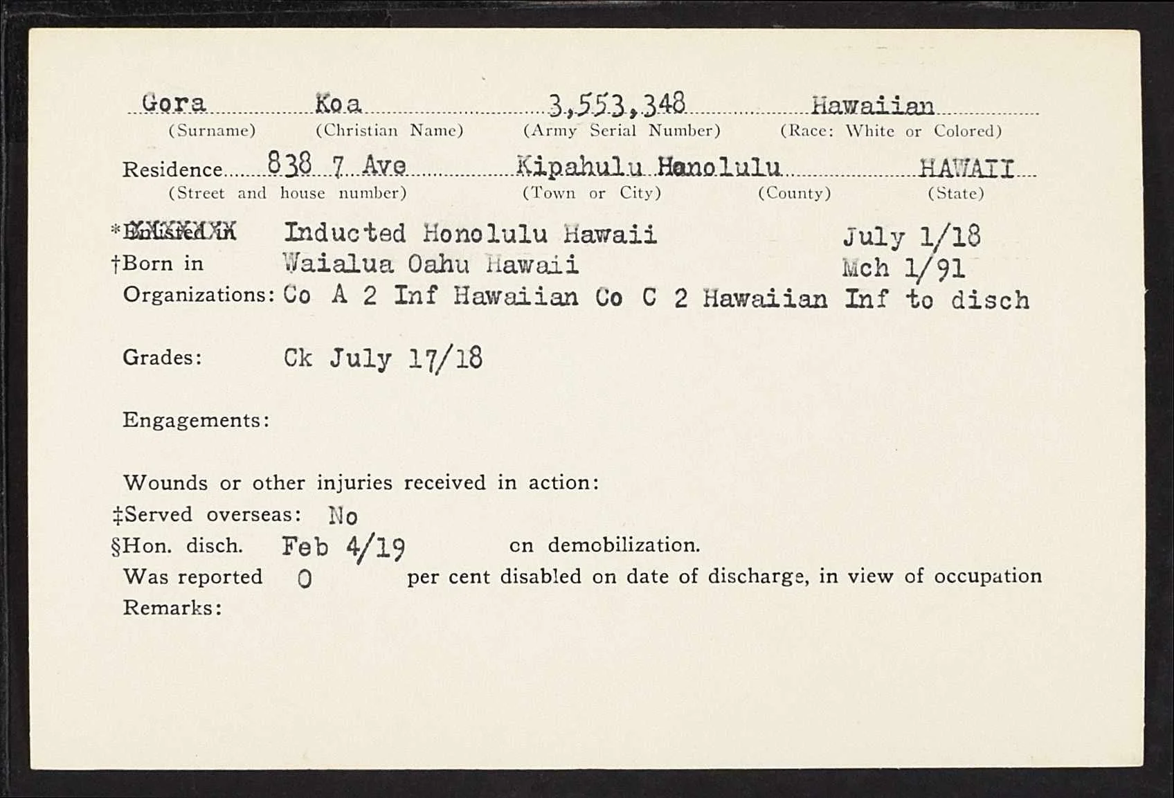 Koa Gora’s military service record.