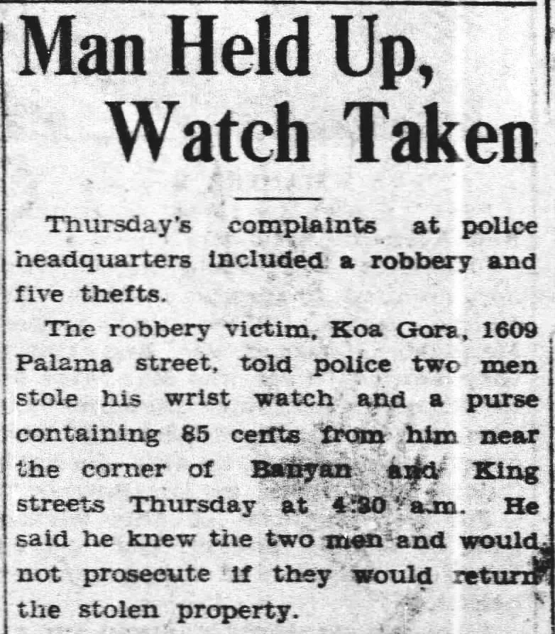 By 1942, Koa Gora found himself back in Honolulu, going by the name “Jake.” He made his living by operating an unlicensed rooming house, “Jakeʻs Place,” a common practice to accommodate the influx of American troops during World War II. The business operated in a Portuguese neighborhood on the slopes of Punchbowl, where it soon attracted the attention of authorities; he was fined $100 (approx. $2,000 today) for hosting a so-called "wild party."
