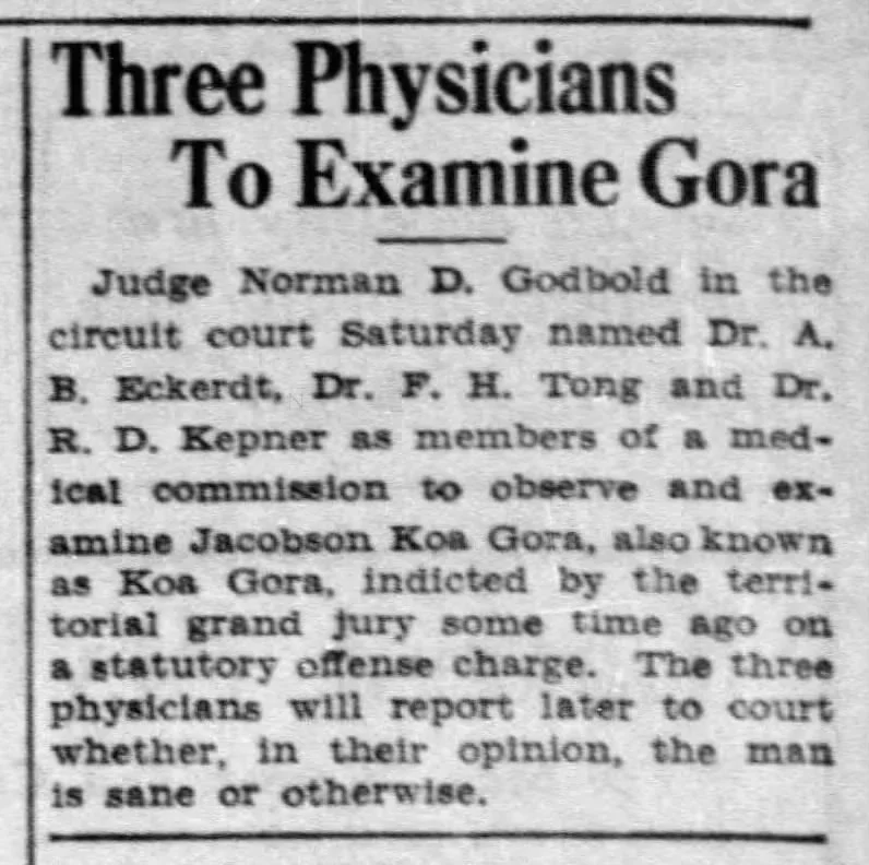 In 1934, newspaper reports indicated that Koa was indicted for a charge linked to "moral turpitude," a common euphemism that the press used for same-sex activity. Court records show that he was indicted for “the abominable and detestable crime of sodomy,” and that his defense team requested a medical examination. After three doctors declared him insane, which they attributed to cerebro-spinal Syphilis, the criminal charges were dropped and he was committed to the Territorial Hospital for the Insane in Kaneohe. This use of the insanity defense as a means to explain queer relationships reflected societal attitudes of the day—that homosexuality was a mental illness.