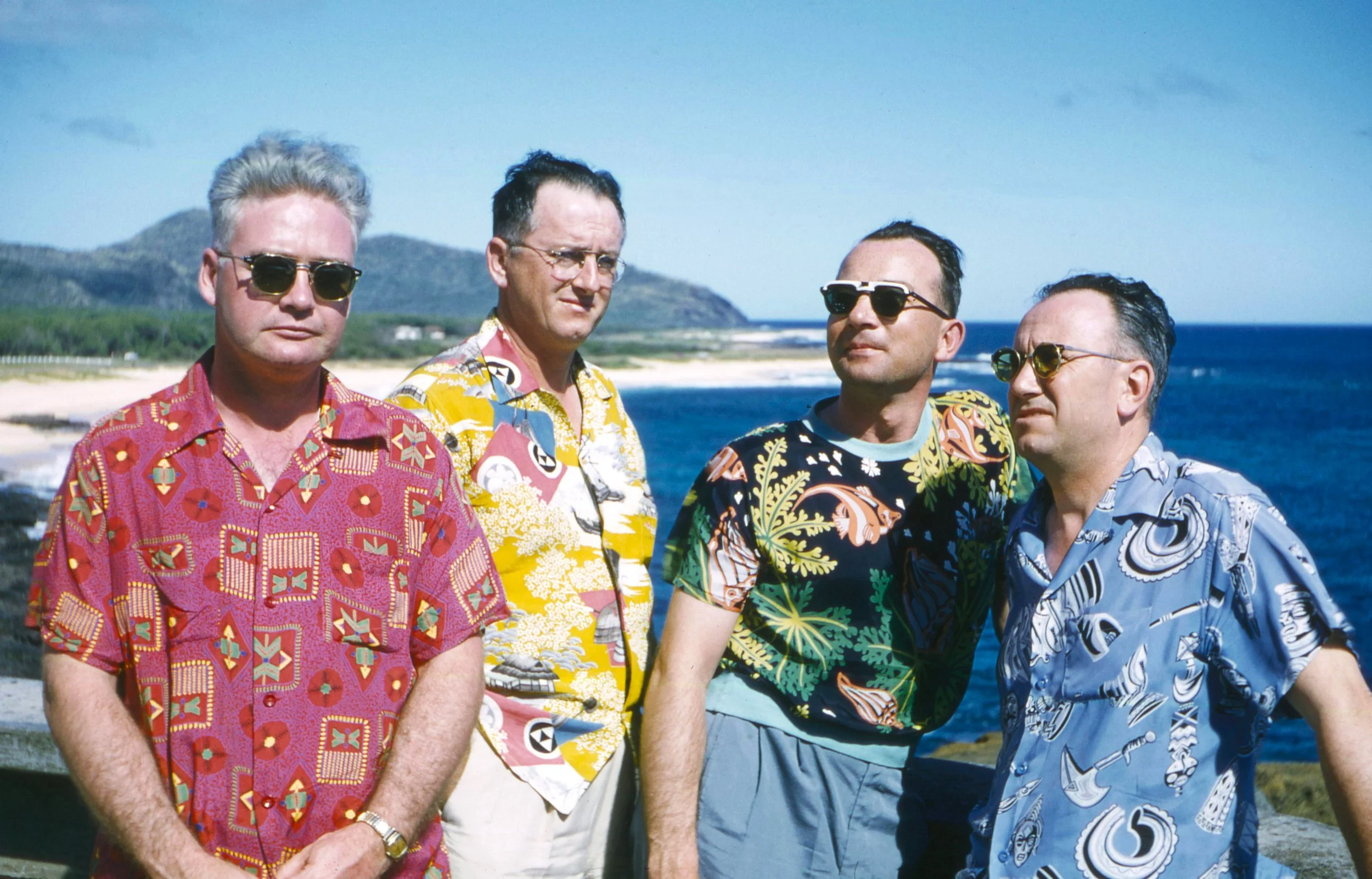 A group of five men vacationed in a penthouse suite at the Edgewater Hotel in Waikiki sometime from 1955 to 1957. We don't know their identities, but they posed for a bunch of friendly and affectionate photos with each other to commemorate their visit. Draw your own conclusions about the nature of their relationships.